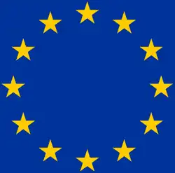 O emblema da EU é uma bandeira azul com 12 estrelas douradas.