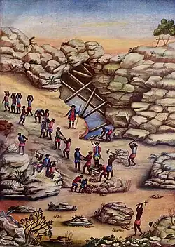 A mineração no Brasil começou no século XVII, com as entradas e bandeiras, que exploravam o interior do Brasil em busca de metais valiosos, como ouro, cobre, prata, e pedras preciosas. No século XVIII, estas foram descobertas nas regiões onde hoje são os estados de Minas Gerais, Mato Grosso e Goiás. A descoberta de pedras preciosas e ouro nessa região causou uma imigração vindo de Portugal e uma migração vinda de vilas populosas da colônia. A corrida pelo ouro causou um conflito entre bandeirantes paulistas e forasteiros "emboabas", a Guerra dos Emboabas.