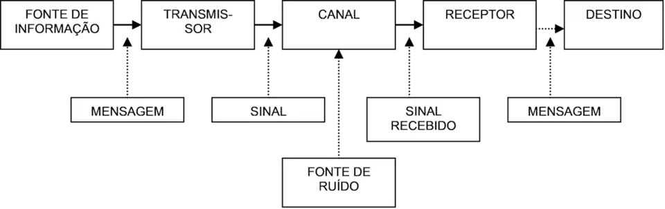 Segundo o modelo textualmente descrito por Shannon e Weaver[27], aqui esquematizado na Figura 6, a fonte de informação elabora e envia a mensagem ao transmissor, que a transforma em forma de sinal. Este pode estar sujeito a ruído (tudo o que interfere na comunicação, prejudicando-a) e por esta razão, o sinal emitido pode ser diferente do sinal captado. O receptor capta o sinal e retornando-o à forma inicial de mensagem, de maneira que esta possa ser percebida, interpretada e compreendida pelo receptor. O esquema foi criado em 1949 por Claude Shannon e Warren Weaver ao enunciarem A Teoria Matemática da Comunicação. Pode ser criticado por sua linearidade, incompletude e estatismo, pois foi concebido no campo técnico da comunicação.
