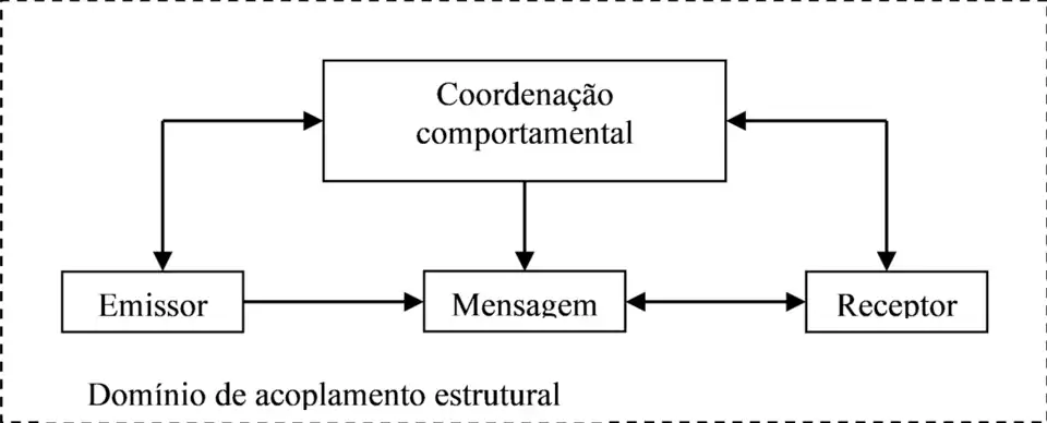 Para Maturana e Varella[26], num dado domínio de acoplamento estrutural as condutas comunicativas seriam aquelas que ocorrem num acoplamento social, onde estão imersos emissor, receptor e mensagem, sob a influência de uma coordenação comportamental. A Figura 5 esquematiza tal modelo: