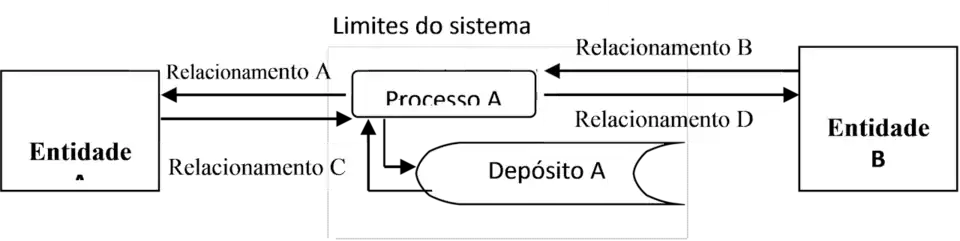 Dentro do sistema de informações, o locus onde se dará o processamento de dados é chamado “processo”, e outra figura desse arcabouço é denominada “depósito de dados”, onde estarão armazenados os dados a serem processados. Um esquema gráfico muito usado nessa área é o Diagrama de Contexto. Genericamente pode ser definido conforme a figura 16: