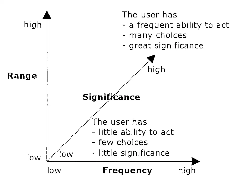 Ao descrever o modelo, Laurel sugere três variáveis a serem consideradas no estudo da interatividade: frequência (quais momentos pode haver reação), amplitude (número de escolhas disponíveis) e significância (que impacto as escolhas têm). Segundo a autora haverá maior interatividade proporcionalmente ao crescimento dessas três variáveis. Ainda assim, o modelo permanece limitado a escolhas pré-determinadas.