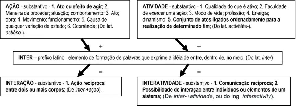 De outra forma, reconstruindo o verbete interatividade desde sua origem, unindo-se o prefixo inter com o substantivo activitáte, obtém-se de suas respectivas definições (Figura 20): dentro de um conjunto de atos ligados ordenadamente para a realização de determinado fim. Ou seja, a interatividade pode ser também entendida como: dentro de um processo para a realização de determinado fim. Lembrando que a aquisição do conhecimento é um processo com fim determinado, pode-se inferir que na aquisição do conhecimento a interatividade está intrínseca.