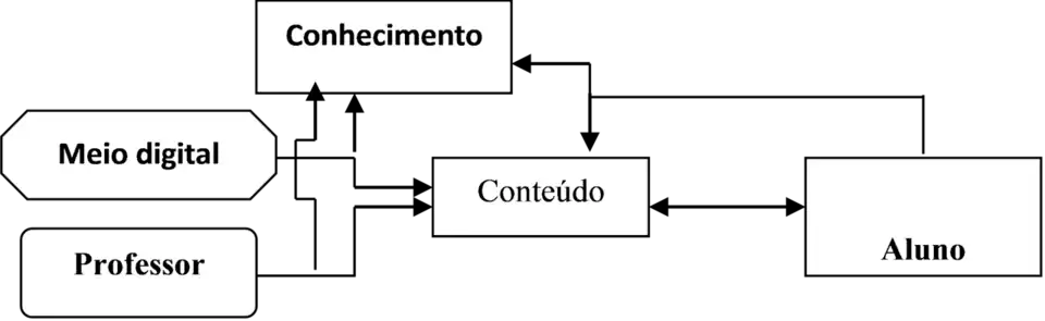 Intentando esquematizar o modelo de interatividade educativa, faz-se a primeira adaptação do sistema dinâmico interativo variado, descrito por Cornock e Edmonds, para neste modelo translato, substituir o fator tempo por professor, ambiente por meio digital, trabalho artístico inicial por conteúdo, participante por aluno e trabalho artístico final por conhecimento, obtendo-se no modelo transposto aluno, professor e meio digital, modificando conteúdo e aluno de tal forma que surge um novo objeto: o conhecimento.