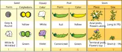 Muitas variedades de ervilheira encontravam-se à disposição na altura e Mendel optou por debruçar-se sobre sete caracteres diferentes, relativamente simples e bem distintos uns dos outros (tais como: a forma da semente, a cor, a cor da flor, etc.) e iniciou o seu estudo com a análise da transmissão de cada carácter isoladamente – mono-hibridismo (transmissão de uma característica hereditária. Cruzamento de indivíduos que diferem pelas formas alélicas de um par de genes).