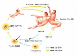 Deste modo, diz-se que a fecundação e a meiose juntas, ocorrendo de forma alternada, constituem um ciclo de reprodução sexual em que existem dois “Jogos” de cromossomas presentes nas células somáticas em indivíduos adultos, que são referenciados como sendo diplóide (2n)(em grego di=dois), mas apenas um ”jogo” de cromossomos presente nos gametas, que são referidos como sendo haplóide (n)(em grego haploos=um). A sua fenomenal característica é que a descendência herda os cromossomos dos dois progenitores, ou seja, no nosso caso (humanos), herdamos 23 cromossomos da mãe, contribuído pelo ovo fertilizado no momento da nossa concepção e 23 cromossomos do pai, contribuídos pelo esperma que fertilizou o óvulo. O ciclo de vida de todos os organismos que se reproduzem sexualmente segue o mesmo padrão básico de alternância entre o número de cromossomos |haplóide e diplóide. Depois da fecundação, o zigoto resultante começa a dividir-se por mitose. Esta única célula eventualmente dá origem a todas as células no adulto, exceto no caso de raros acidentes ao longo do processo.
