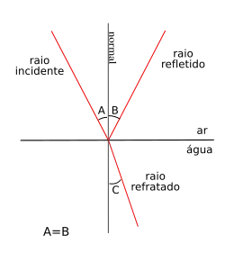 Considere um raio de luz que incide sobre uma superfície que separa dois meios (na imagem, o raio vem do ar e entra na água).