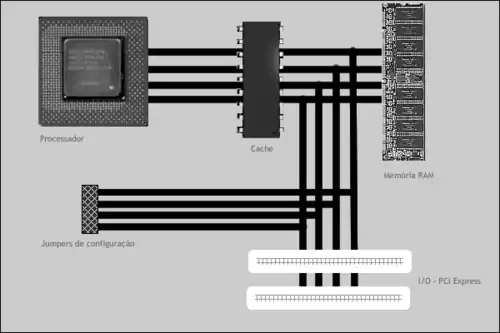 O esquema apresenta dois dispositivos de entrada (PCI Express - aquelas onde nós colocamos a nossa placa gráfica, placa de rede ou placa de som...), quatro pistas de encaminhamento de dados (são mais, muitas mais num computador atual), onde circulam os dados, provavelmente codificados, provenientes das entradas, diretas à central de processamento (CPU ou Processador). Aí, os milhões de transístores existentes dentro dessa caixinha, irão processar e criar novos dados que serão distribuídos pela rede interna do PC, segundo a codificação apresentada nos dados de entrada. O Processador pode guardar dados dentro da memória RAM e na memória Cache, sendo que, para a memória RAM irão dados menos usados e para a Cache os dados mais acessados pelo processador. Os Jumpers controlam, além da velocidade de processamento, que tipo de entradas poderão gerar dados, entre outras coisas. O mesmo processo se sucede aos dados que retornam aos dispositivos I/O. Et voilà, aqui está uma explicação muito, muito resumidinha de toda a teoria de processamento de um computador.