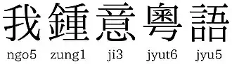 Todas as línguas siníticas (relacionadas à China) e dialetos, incluindo cantonês são escritas em Hànzì (Mandarim)/Honji (Cantonês), um sistema de escrita imagem. Assim mesmo, muitos estudantes de fala inglesa aprendem a pronunciar o cantonês usando o sistema de romanização. usualmente usando Romanização Yale ou Jyutping. Veja abaixo alguns exemplos: