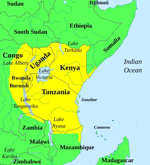 As pessoas falam swahili primariamente em Zanzibar e na Tânzania. Há pequenas comunidades de falantes de swahili no Burundi, Quênia, Mayotte, Moçambique, Omã, Ruanda, Somália, África do Sul, Uganda, Emirados Árabes e Estados Unidos.