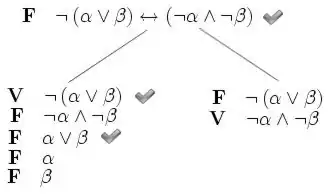 - Analisemos primeiramente no ramo da esquerda, a fórmula , que está marcada como verdadeira. Já sabemos bem como lidar com a verdade de uma negação: