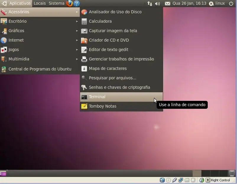 Vá no menu Aplicativos, procure o submenu Acessórios e clique em Terminal