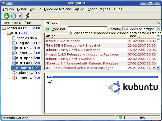 aKregator é um programa "agregador" de notícias em RSS. Ele é muito bom para quem não quer ficar dependendo unicamente da visita em cada site de noticias para ter que ler noticias atualizadas.