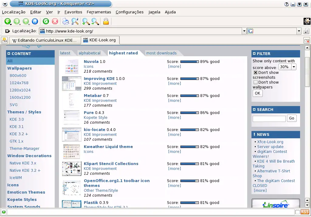 - Aqui você define a cor de cada elemento do ambiente(Painéis, barras de título, fundos, etc). É possível arrastar as cores da janela de cores para os elementos da miniatura. Existem já dezenas de esquemas de cores prontos e você pode criar um novo que mais lhe apraz. Também é possível baixar do site kde-look esquemas prontos de cores ou até submeter o seu! Clique na barra lateral em "Color Schemes", escolha, você pode ver ordenando pelos mais novos, pelos mais baixados, mais populares, etc. Escolha o seu, clique nele e clique em [download]. O Browser vai pedir onde você quer salvar o arquivo .krsc. Salve por exemplo, no seu home(~):/home/seu nome, que deve ser a provável sugestão. Apenas clique então em "Importar Esquema..." na janela do Centro de Controle-Cores e pronto! Seu tema foi instalado e está pronto pra usar!