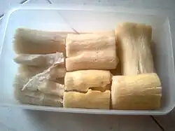- Polvilho: é o amido da mandioca. Também chamado de tapioca. É obtido por decantação do líquido que sai da prensagem da mandioca ralada, no processo de fabricação da farinha de mandioca. Pode ser doce ou azedo. Neste último caso, passa por um processo adicional de fermentação[6]. Entra na receita do tradicional pão de queijo brasileiro, na chipa argentina, paraguaia e do estado brasileiro de Mato Grosso do Sul, no biscoito de polvilho, na panqueca brasileira e paraguaia biju ou mbejú, em bolos e no sagu. Também tem aplicação industrial nas indústrias farmacêutica, de papel e celulose, química e têxtil[7].