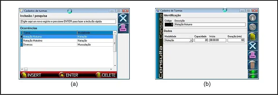 (a) Tela de listagem de dados. Nesta tela é exibida a lista das turmas já cadastradas. Você pode inserir uma nova turma clicando no botão Insert, visualizar ou editar selecionando a turma e clicando no botão Enter e caso a turma não tenha sido associada a nenhum avaliado você poderá excluí-la clicando no botão Delete. (b) Tela de detalhamento de dados. Nesta tela você pode selecionar a modalidade principal da turma, a capacidade de alunos, o horário de início da turma e a duração. Essas informações são utilizadas para que os profissionais possam identificar a turma com maior facilidade durante a avaliação física.