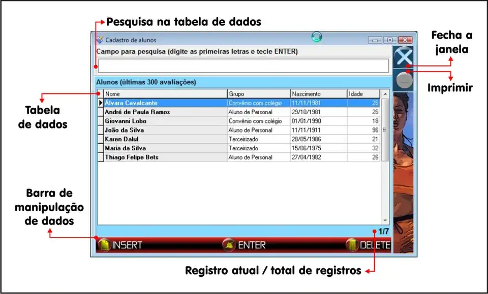 Como já citado, o design básico dos cadastros é padronizado, eles contam com uma barra de cor vermelha que está localizada na parte inferior de cada janela, juntamente com a tabela de dados. Essa barra é chamada de Barra de Manipulação de Dados, ela possui atalhos para os comandos necessários para operar as funções de: