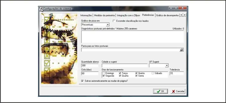 • Pastas para as fotos posturais: durante as avaliações posturais é possível inserir várias fotos para auxiliarem na avaliação postural e ainda servir de registro para comparação da evolução do aluno com os treinamentos. Para que isso seja possível é preciso definir qual será a pasta onde as fotos serão gravadas. Esta pasta preferencialmente deve ser colocada na mesma pasta em que o sistema foi instalado. Se houver mais de uma estação de trabalho, computadores em rede, um dos computadores deve ser definido como servidor e este deverá conter a pasta de fotos, dentro da pasta da Requisito. O cuidado de colocar todas as informações importantes em um único computador facilita a criação de cópias de segurança (Backup);