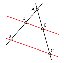 O Teorema de Tales foi proposto pelo filósofo grego Tales de Mileto, e afirma que: quando duas retas transversais cortam um feixe de retas paralelas, as medidas dos segmentos correspondentes determinados nas transversais são proporcionais. Para entender melhor o Teorema de Tales, é preciso saber um pouco sobre razão e proporção. Para a resolução de um problema envolvendo o Teorema de Tales, utiliza-se a propriedade fundamental da proporção, multiplicando-se os meios pelos extremos. Considerando-se o exemplo da figura, tem-se: