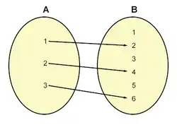 A relação, cujo domínio é A e o contradomínio é B, é especificada por y = 2x. Logo, R = { (1,2),(2,4),(3,6) }.