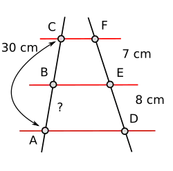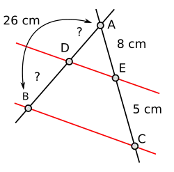 ![]() Pelo teorema de Tales, tem-se a igualdade que neste caso corresponde a ou seja, Multiplicando-se ambos os membros por 26, resulta que Portanto, o lado mede 16 cm. Além disso, tem-se isto é, Consequentemente, Então, o lado mede 10 cm neste caso. |