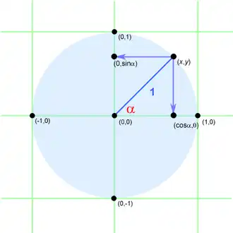Colocando os ângulos notáveis neste círculo obtêm-se os valores (x; y) em que x é o cosseno do ângulo e y o seno: