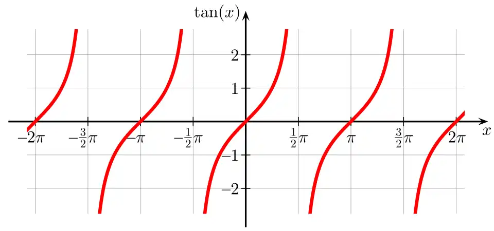 A função tangente é uma função ímpar pois é o quociente de uma função ímpar e uma função par. É, pois, tan (-x) = - tan x {x ∈ R}. O período desta função é igual a π, e sua amplitude estende-se ao infinito. O gráfico da função tangente forma uma tangentoide. Para determinar a tangente de um ângulo qualquer, temos, para 0° ≤ x < 90°: