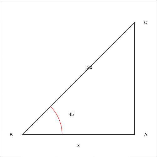 Na figura ao lado, determine o valor de x (cateto AB) dado que a hipotenusa BC vale 20 cm e o ângulo B vale 45 graus.