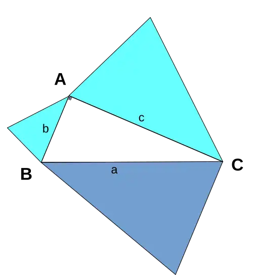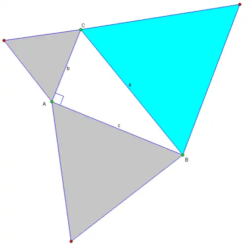 A área do triângulo equilátero construído sobre a hipotenusa é igual à soma das áreas dos triângulos equiláteros construídos sobre os catetos de um triângulo retângulo.