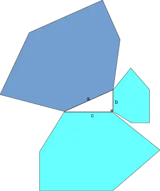 Sejam , e as áreas dos polígonos regulares construídos sobre os lados do triângulo retângulo. Assim, temos que , e , onde , e são, respectivamente, as áreas de dos triângulo em que foram decompostos cada um dos polígonos regulares construídos sobre a hipotenusa e os catetos do triângulo ABC.