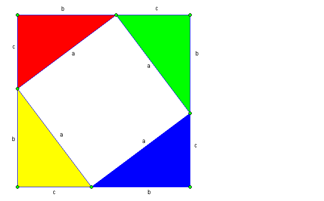 Daí, segue que a área do quadrado ABCD, de lados , é igual à soma das áreas dos quatro triângulos retângulos, de lados a, b e c, e do quadrado MNPQ, de lados a. Ou seja, , como queríamos demonstrar.