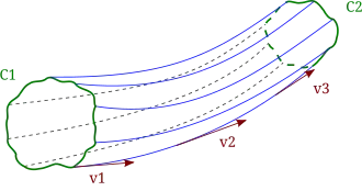 Como, em um fluxo de regime permanente, as trajetórias coincidem com as linhas de corrente, a distância l percorrida ao longo da linha de corrente constitui-se, nesse caso, numa coordenada conveniente para se escreverem as equações de movimento. Um sistema de coordenadas que use essa distância, mais a coordenada n, normal às linhas de corrente, é chamado de sistema de coordenadas de linhas de corrente. Esse sistema de coordenadas também pode ser usado para descrever fluxos em regime estacionário; nesse caso, como já visto, as linhas de corrente dão uma representação gráfica não da trajetória de volumes do fluido, e sim do campo de velocidades.