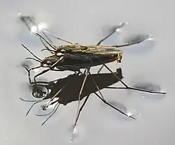 É interessante notar na foto que em torno de cada uma das patas do inseto, surge uma pequena depressão. Elas podem ser imaginadas como pequenas canoas sobre as quais se apóia o inseto; em conjunto, elas o mantém na superfície sem afundar. O volume dessas pequenas depressões, se somado e medido o seu equivalente em água, fornecerá exatamente o peso do inseto.