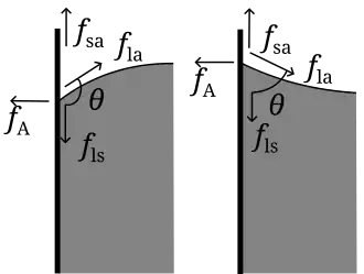 Ou seja, se a tensão superficial na interface parede/ar for maior que a tensão superficial na interface líquido/parede o ângulo de contato será menor que 90°; caso contrário, o ângulo de contato será maior que 90°. Se a diferença entre essas tensões for exatamente igual à tensão superficial na interface líquido/ar, o ângulo de contato será igual a 180°. Finalmente, se a tensão superficial nas interfaces parede/ar e líquido/parede for igual, o ângulo de contato será exatamente igual a 90°.