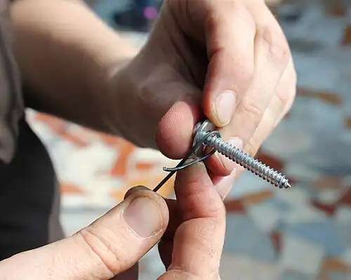4. Meça e corte o arame de acordo com a altura que você deseja para seu jardim vertical. Insira a arruela no parafuso e enrosque a extremidade do arame no parafuso (duas a três voltas).