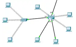Agora vamos criar os computadores. Será demostrado a compatibilidade entre os protocolos ethernet, Fast ethernet e gigabit ethernet|Gigabit ethernet. Crie 3 computadores que por padrão tem conexão Fast Ethernet e conecte ao hub através do cabo par-a-par(Straight-Through), cada um aos 3 tipos de protocolos. Veja que depois de um tempo, a luz ficará verde indicando o funcionamento correto. Crie mais dois computadores, agora com um conector Ethernet e outro com Fast Ethernet e conecte cada um ao protocolo oposto (Giga em Ethernet). Uma porta fast ethernet ficará livre como porta de saída. Veja a completa compatibilidade entre cada tipo de conexão.