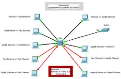O mesmo não vai ocorrer com os protocolos de fibra optica. Crie mais 4 computadores, dois com conectores de fibra optica para fast ethernet e dois de fibra para GigaBit Ethernet. Conecte um computador ao mesmo protocolo e outro ao oposto com o cabo de fibra optica (fiber). Nesse caso, não temos compatibilidade, apenas irá funcionar o protocolo com seu igual. Até o mais novo (Gigabit Ethernet) não é compativel com o mais antigo.