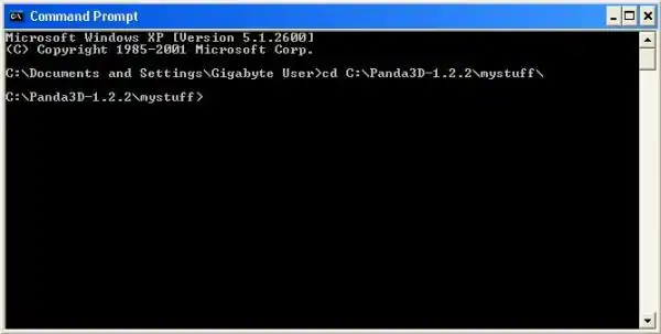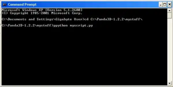 Após instalar o Panda3D, entre no Prompt de Comando do Windows (Iniciar > Todos os programas > Acessórios > Prompt de comando), por padrão ele abre a pasta Meus Documentos, se você salvou o seu arquivo .py em outra pasta você deverá mudar a localização do ponteiro do DOS, para isso utilize o comando cd e a pasta onde você salvou o seu arquivo, por exemplo: