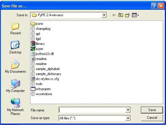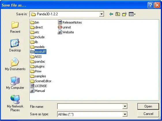 No topo dessa nova janela tem uma caixa de texto "Save in:", que aponta para "PyPE-2.8-win-ansi", você NÃO quer salvar seu script aqui, então clique na pequena seta para baixo proxima á caixa de texto, e navegue para baixo na lista, e clique "Disco Local (C)", então de duplo clique na pasta Panda3D para abri-la. Ache a pasta "minhascoisas" que nós criamos antes e dê duplo clique para abri-la.