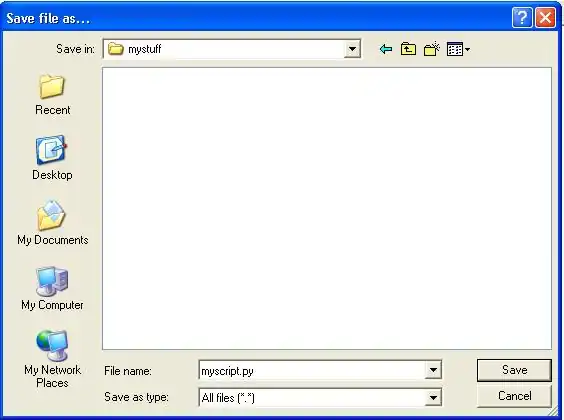 Agora, digite o nome do seu script na caixa de texto "File name:". Eu chamei o meu de meuscript.py ( tenha certeza de botar .py no fim do nome ). Então clique no botão "Save".
