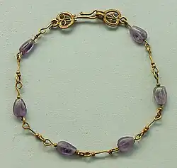 - AMETISTA: é a variedade roxa do quartzo. É o símbolo do "terceiro olho" dos místicos. Segundo a lenda, foi criada quando o deus grego do vinho, Dionísio, ficou irado com os homens e jurou lançar tigres contra o primeiro ser humano que cruzasse a sua frente. Uma mulher chamada Ametista, que se dirigia ao templo da deusa grega Ártemis, surgiu e foi atacada pelos tigres. A deusa Ártemis teve piedade da mulher e transformou-a em cristal, para que ela não sentisse mais dor. Arrependido, Dionísio derramou vinho sobre o cristal, tornando-o violeta.[2]