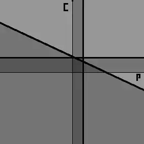 As linhas mais finas representam o eixo X e Y, os quais representam respectivamente o número de mesas (M) e cadeiras (C). Todos os pontos dentro ou abaixo àquela reta grossa mais inclinada representam pontos que satisfazem a Restrição 2. Todos os pontos dentro ou abaixo àquela reta grossa menos inclinada satisfazem a Restrição 1. Pontos à direita da reta Y e acima do eixo X satisfazem a exigência de que não podemos fabricar um número negativo de objetos. Quanto mais restrições um ponto no gráfico acima satisfaz, mais escuro ele aparece. A única região onde todas as restrições são satisfeitas é aquele triângulo escuro localizado próximo ao centro do gráfico. Os vértices do triângulo são os pontos (0,0), (0,10) e (5,0).