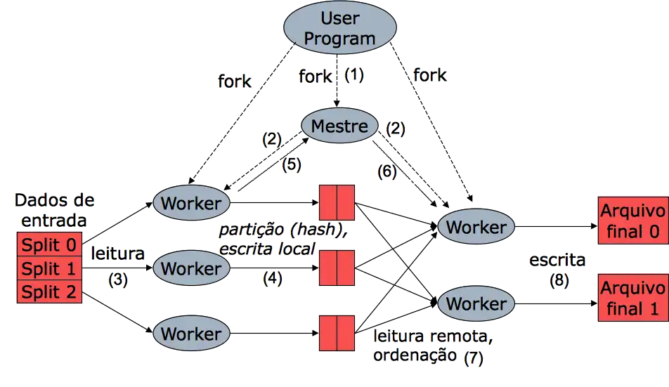 Com base na informação sobre o arquivo de entrada, o mestre identifica os trabalhadores que foram disparados mais próximo de cópias dos blocos do arquivo e atribui a cada um deles parte das tarefas de map, identificando os pedaços do arquivo que devem ser processados por cada trabalhador, denominados splits (2). Os trabalhadores começam então a ler pedaços do arquivo e produzir os pares chave/valor para a tarefas de map (3). Os pares chave/valor produzidos nessa etapa são assinalados para um dos processos trabalhadores escolhidos para a redução por uma função de assinalamento. Essa função é normalmente uma função de hash simples, parametrizada pelo número de redutores, mas pode ser substituída por outro tipo de mapeamento definido pelo usuário. O resultado do map é então armazenado localmente na máquina em que cada trabalhador executa, agrupado pelos identificadores dos processo de redução assinalados pela função de mapeamento (4). À medida que tarefas de mapeamento sobre splits completam, os trabalhadores informam o mestre sobre quais chaves foram geradas no processo e identificam os arquivos gerados para cada nó responsável pela redução (5).