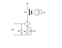 O tubo na imagem é chamado automaticamente (ou auto) polarizado, isto é, uma pequena resistência do cátodo (Rk) garante que o tubo seja negativamente polarizado. No entanto, isso significa que a resistência da grade (Rg) não deve ser muito grande (<1M normalmente).