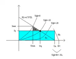 Imax e Umax refletem o que acontece ao carregar o tubo. Você tem uma voltagem máxima, Umax, que você planeja colocar no tubo. Mas você entende que precisa colocá-lo por meio de uma resistência anódica (a resistência do catodo é tão pequena que negligenciamos isso). Então a linha de carga chamada RL na figura mostra como o tubo irá funcionar. A corrente máxima, Imax, nunca será alcançada e é igual a Umax, dividida pela resistência do ânodo, neste caso chamada RL.