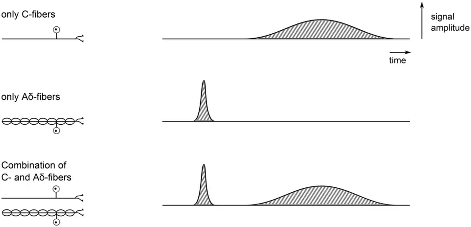 O aumento do diâmetro e a presença de mielina aumentam a velocidade de condução do sinal até à medula espinhal. As fibras Aδ conduzem o sinal nociceptivo de forma relativamente rápida, razão pela qual são responsáveis pelo reflexo nociceptivo (e.g. remover rapidamente a mão de objecto quente) e pela localização precisa da dor. Em contrapartida, as fibras C possuem uma baixa velocidade de condução (não são mielinizadas e têm um diâmetro pequeno) e levam portanto a uma dor difusa, mais difícil de localizar e mais duradoura.