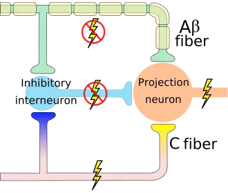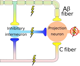 A teoria de gate control foi desenvolvida por Melzack & Wall em 1965[5]. Esta teoria sugere que a dor pode ser inibida na primeira sinapse, isto é, entre as fibras aferentes primárias e os neurónios secundários ao nível da medula espinhal. Quando as fibras C disparam, eles não só transmitem o sinal nociceptivo ao neurónio secundário, como também inibem os interneurónios inibitórios. Isto é interpretado como a gate estando fechada, sendo os sinais nociceptivos os únicos que são transmitidos. No entanto, se fibras Aβ também transmitirem potencias de acção (PA), elas excitam os interneurónios inibitórios. Assim, a activação do neurónio secundário não é limitada a estímulos nociceptivos, o que é interpretado como a gate estando aberta. Dependendo da frequência relativa de PA entre as fibras C e Aβ, o sinal nociceptivo pode ser inibido.
