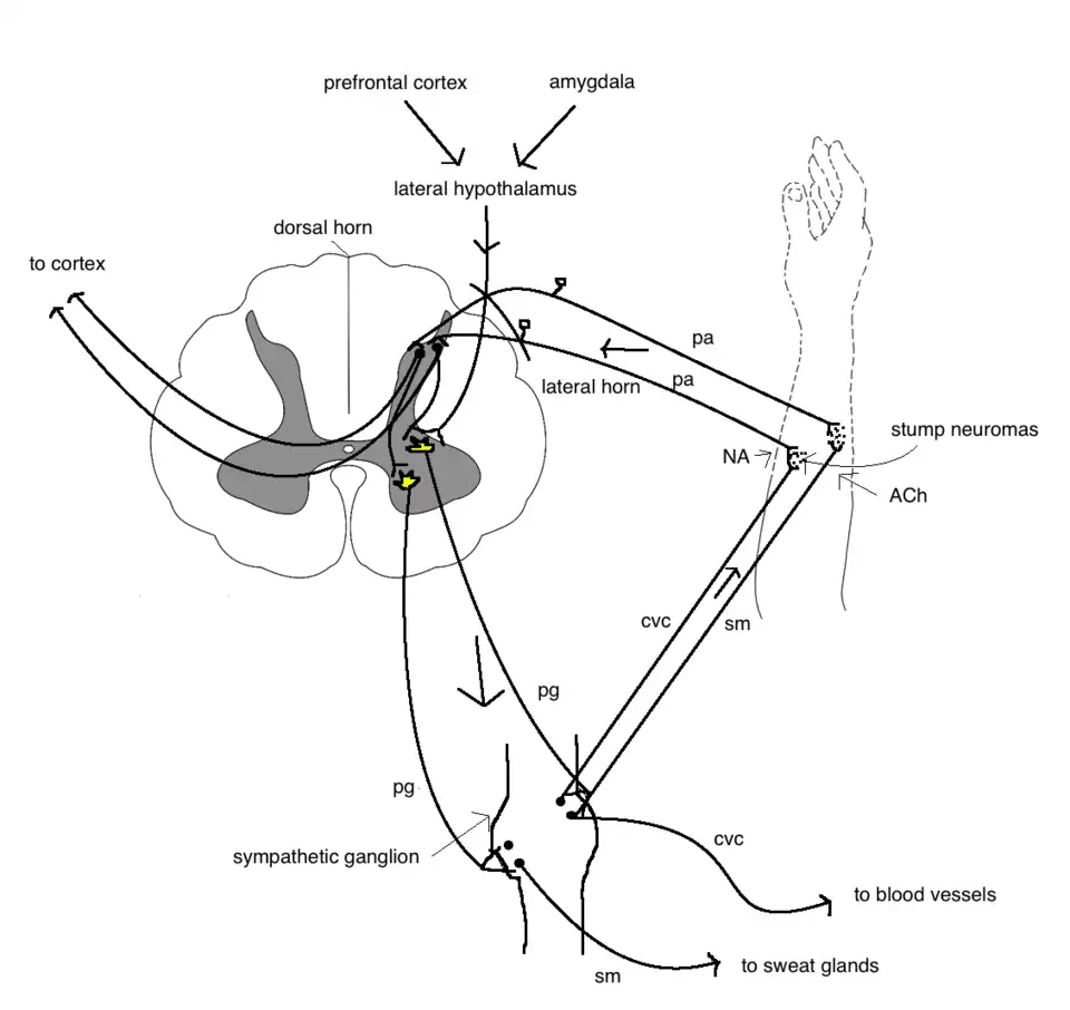 Dentro dos neuromas, terminais nervosos eferentes ficam entrelaçados com fibras nociceptivas aferentes, resultando em interacções directas entre ambos e num aumento da actividade simpática, com agravamento da dor. [23]