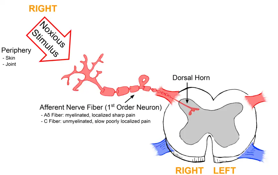 De seguida, os terminais nervosos livres são activados pelo estímulo nocivo. Eles efectuam a transdução de sinal e transmitem de seguida sinais eléctricos ao corno posterior da medula espinhal.