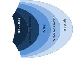 - Estroma: uma camada composta de fibras de colagénio paralelas. Esta camada constitui cerca de 90% da espessura da córnea.